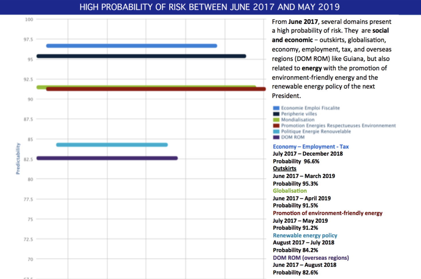 Social Risks Related to Energy Taxation Pointed out as Early as April 2017 / French Social and Political Movements of November and December 2018 From March 31st through May 5th, 2017, based on the AI advanced system Mileva, analyses on the French presidential election and its possible developments were carried out. On several occasions, results pointed out the connection between high social risks and energy-related issues, notably their taxation. Those findings clearly anticipated the French social and political movements of November and December 2018.